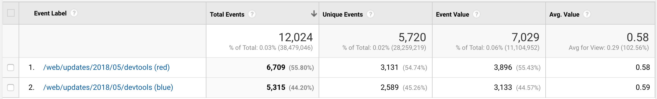 - The Avg. Value column represents what option the users chose. Clicking "No" sent a value of 0, clicking "Yes" sent a value of 1. In other words, the value of 0.58 for red meant that 58 out of 100 users who saw red buttons found the doc helpful. Which, by the way, was surprisingly low. More on that in Next steps.